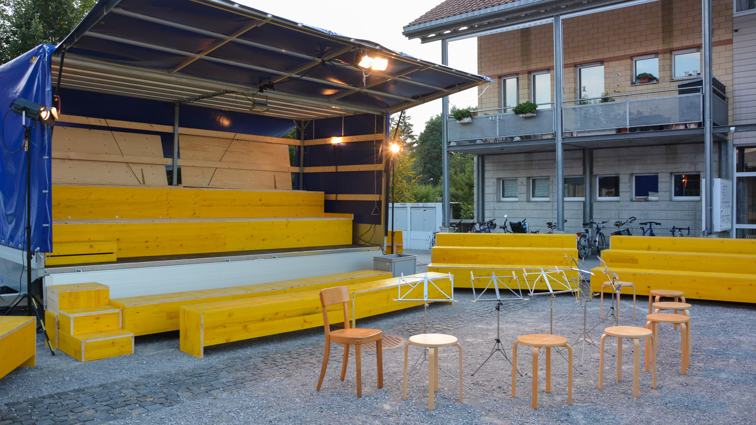 Mit unserer mobilen Sitztribüne verwandeln wir jeden Winkel in ein Theater. «Ich konnte mir nicht vorstellen, wie lauschig das Pärkli wird, wenn Ihr darin spielt.» Wechseln in Theaterhäusern die Bühnenbilder, wechseln wir die Spielorte. Folgen Sie uns und schauen Sie sich’s an. Es ist die Alltagsumgebung, die wir mit Theater und Musik für Sie verzaubern.